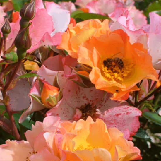 Prachtige roos met 3 kleuren (oranje, roze  : 6 maanden lang massa’s bloemen, ziektevrij, onderhoudsarm en druk bevlogen door bijen.